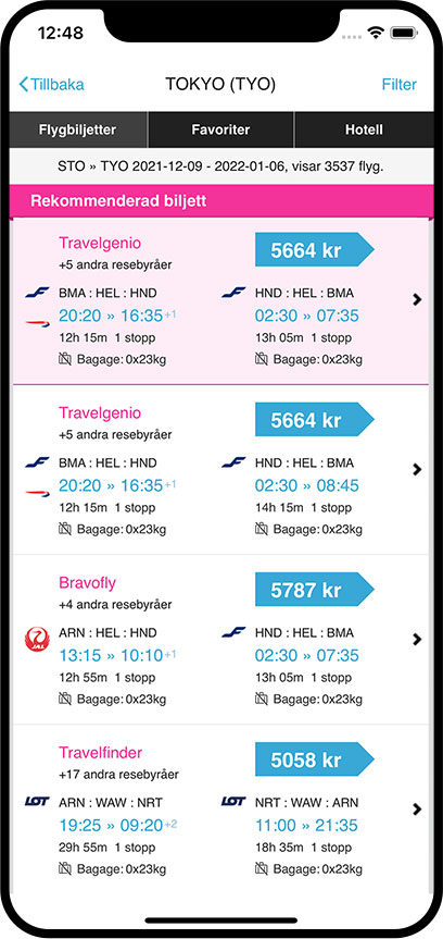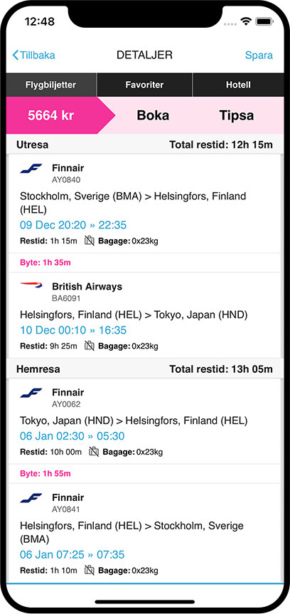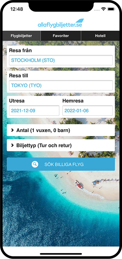 Sök och jämför flygbiljetter med vår app för iPhone och Android och hitta billiga resor, var du än befinner dig!
